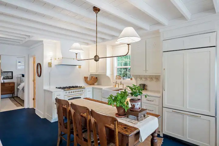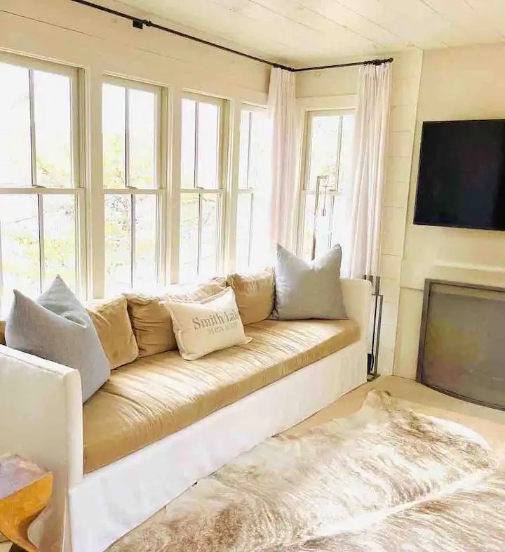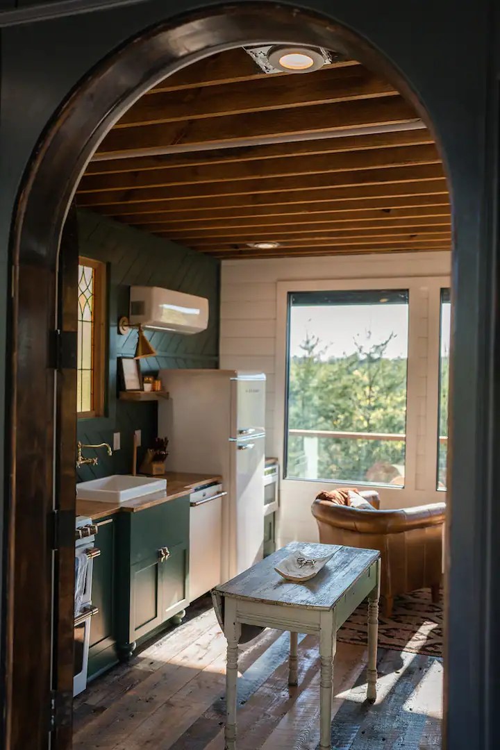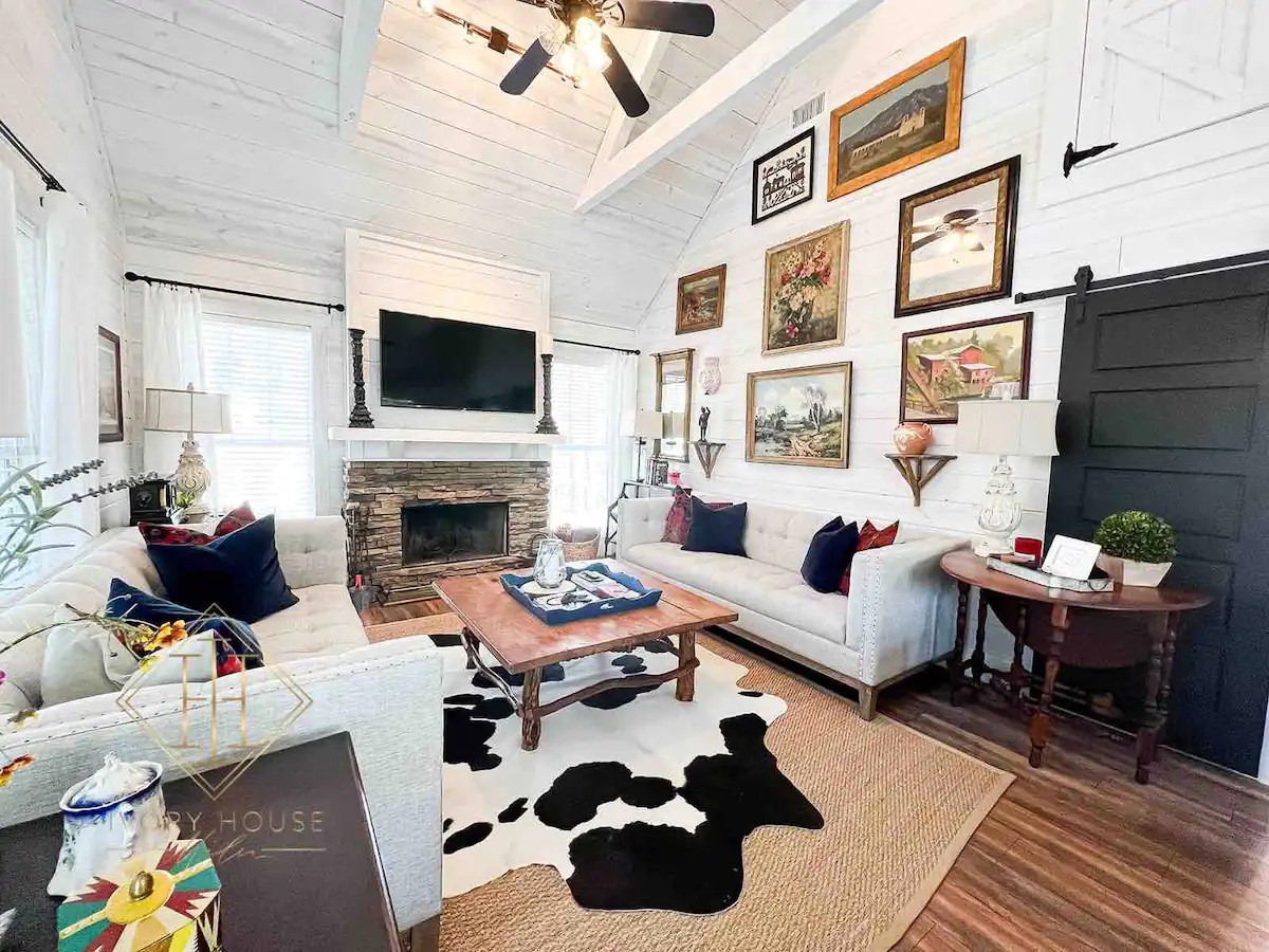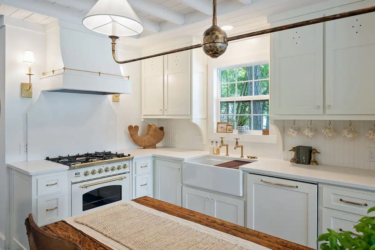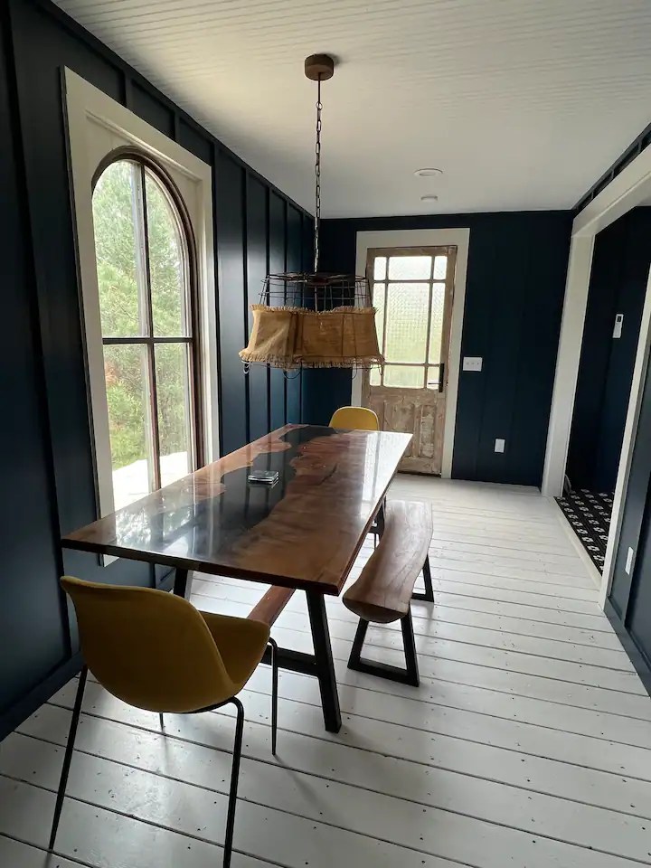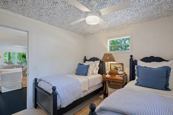 The living room in this cottage makes me want to book a stay. Jennifer truly has an eye for design. She filled the home with unique designer details, from the gorgeous kitchen, to the wallpaper ceiling in the guest bedroom. This cottage makes any guest feel like they have stepped into a tranquil escape from the busy world.