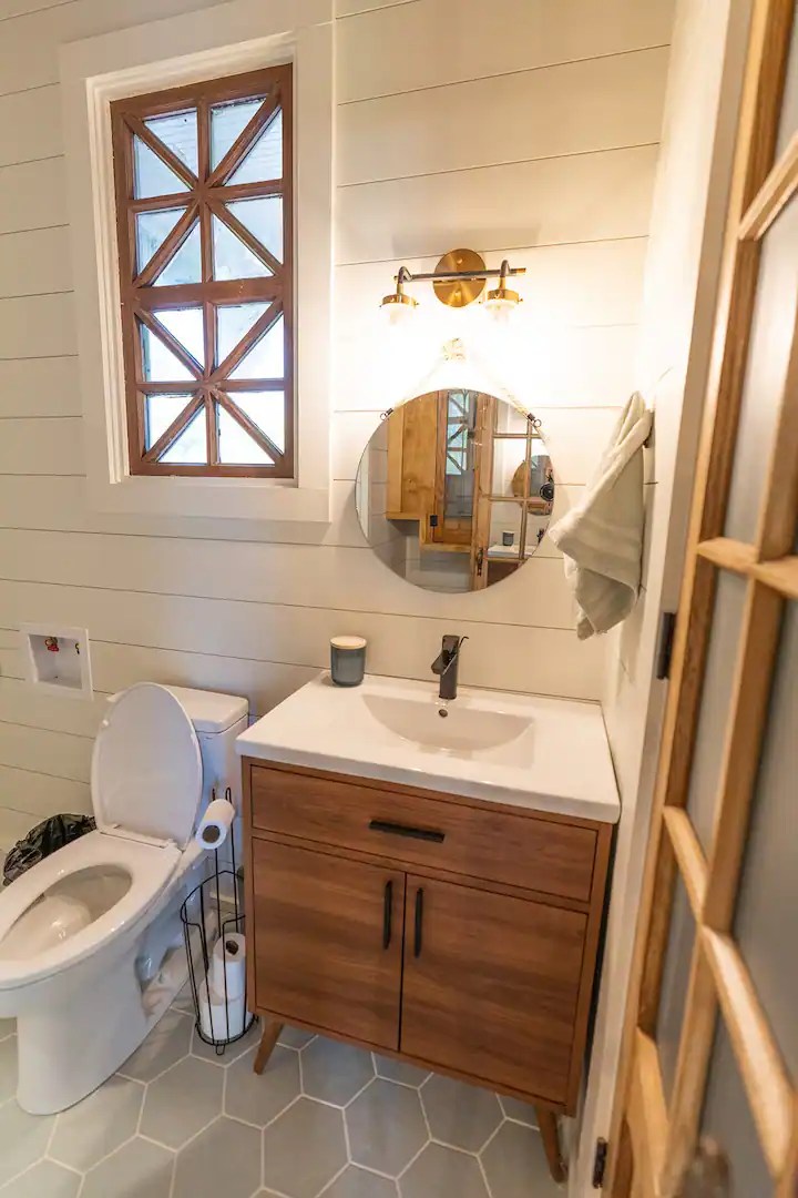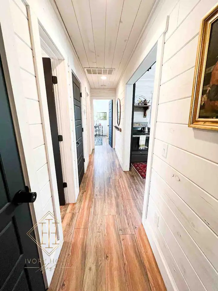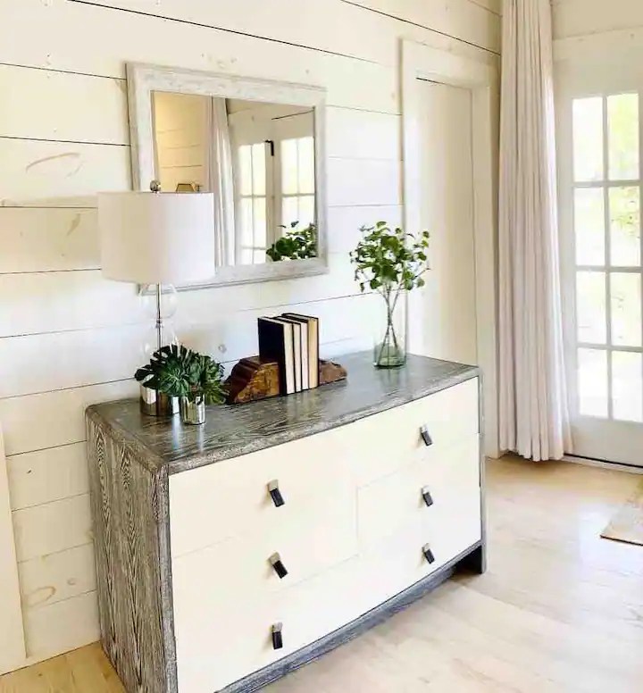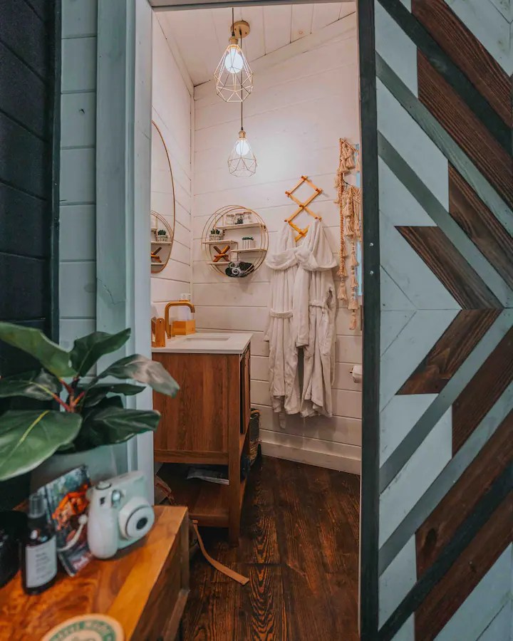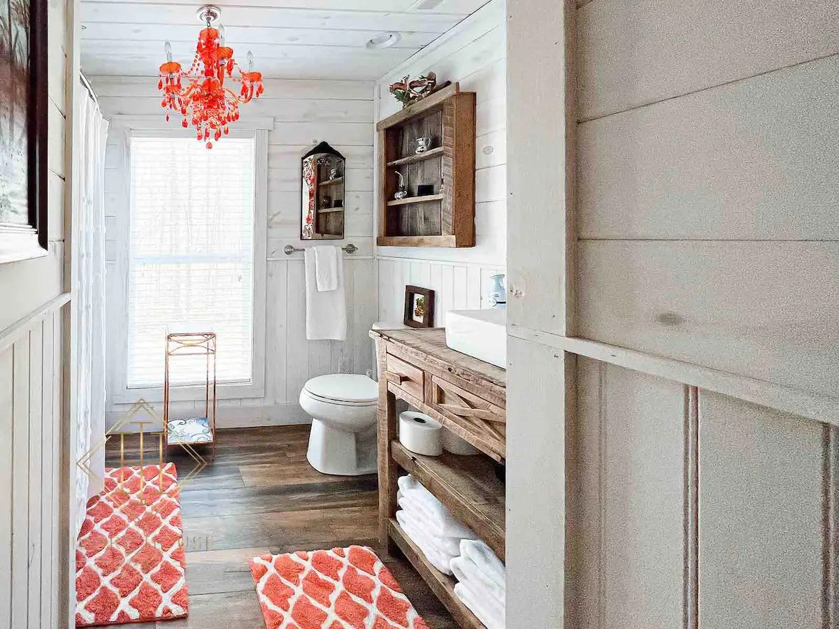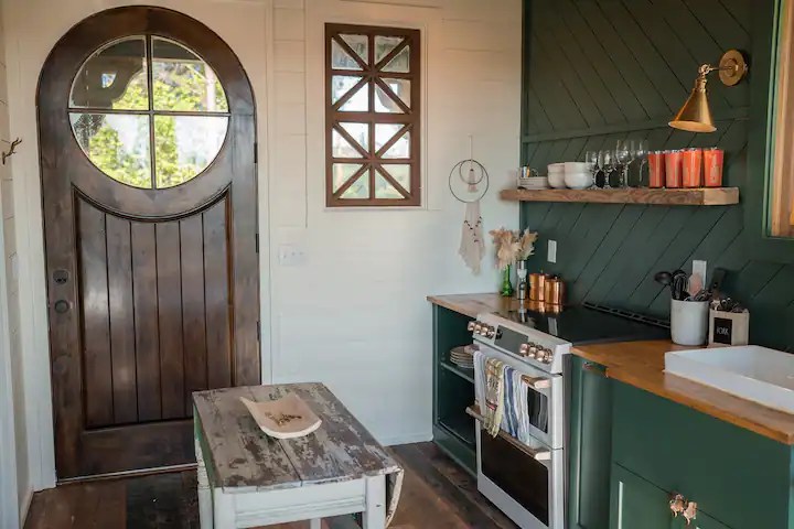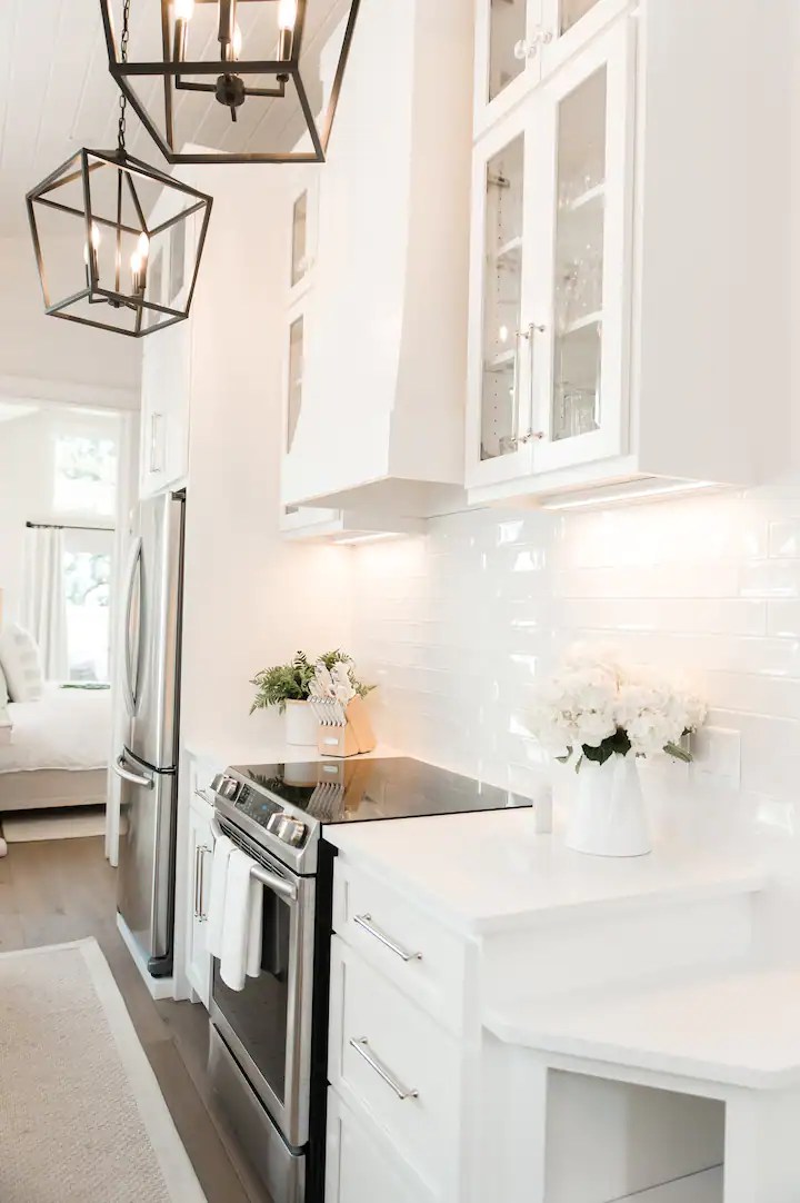 The living room in this cottage makes me want to book a stay. Jennifer truly has an eye for design. She filled the home with unique designer details, from the gorgeous kitchen, to the wallpaper ceiling in the guest bedroom. This cottage makes any guest feel like they have stepped into a tranquil escape from the busy world.