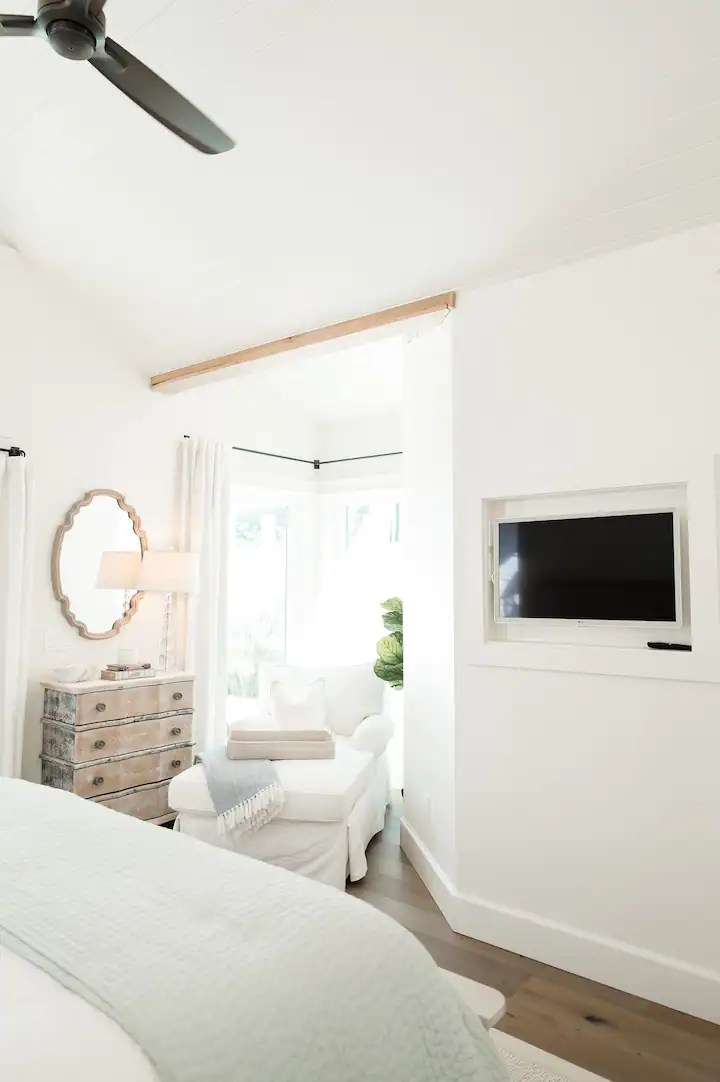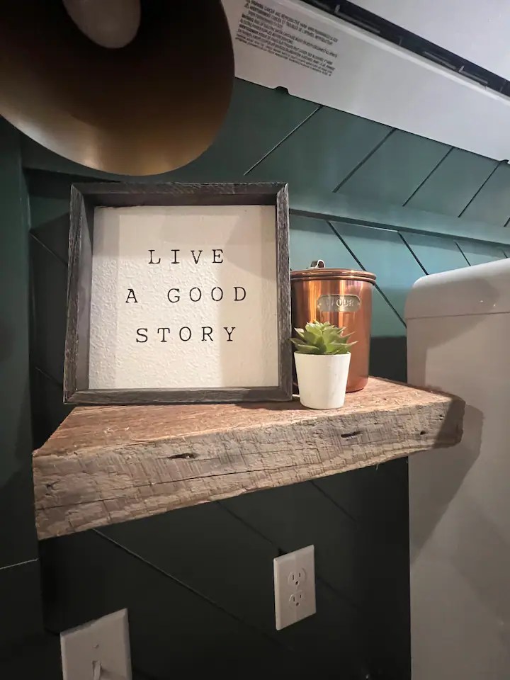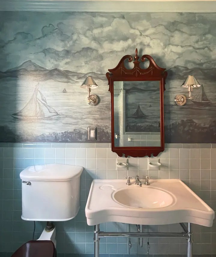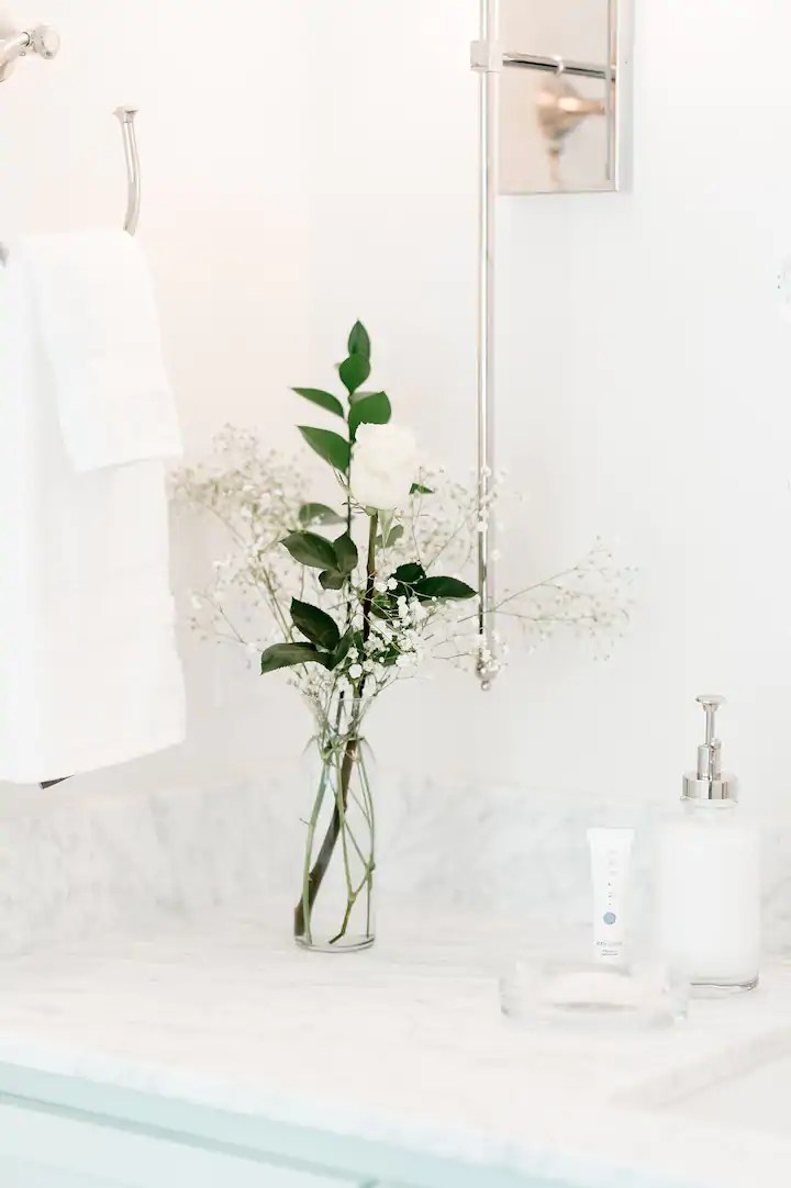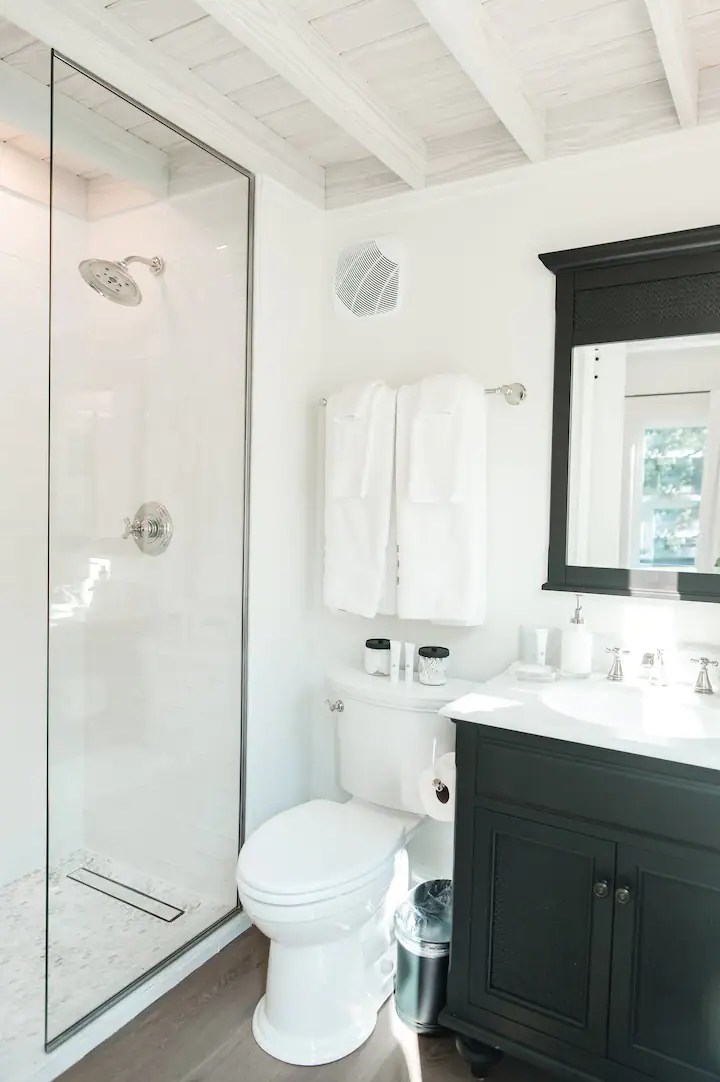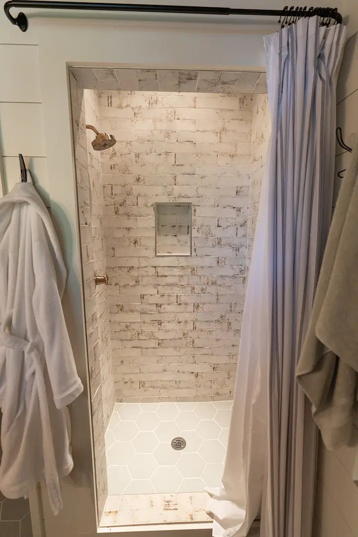 The living room in this cottage makes me want to book a stay. Jennifer truly has an eye for design. She filled the home with unique designer details, from the gorgeous kitchen, to the wallpaper ceiling in the guest bedroom. This cottage makes any guest feel like they have stepped into a tranquil escape from the busy world.