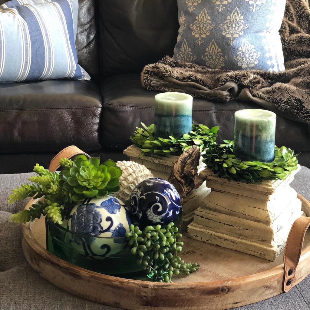 Adding a plant will bring life to the room. I mixed a vintage bowl with balls, bark, and succulents for my ottoman. As you all know I love blue willow and these blue and white balls are perfect to coordinate with the style. The driftwood I found at an antique store on the beach. And I always mix faux succulents in my bowl arrangements. If you do not have a green thumb a bowl of balls and succulents is easy upkeep. If you only want to water a plant once in a while, opt for a succulent arrangement or a terrarium. It is still beautiful but not as much work. Your final choice is to have fresh-cut flowers in a bowl that is replaced weekly.