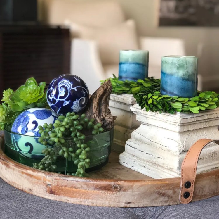 Pro Tip: Make the shape of your tray different from your ottoman. Therefore, if you have a square ottoman, use a round tray.